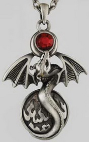 Created with a flat quartz crystal forming the body of the pendant, tCrafted from the finest lead-free pewter and hanging 1 3/4" long and 1 3/8" wide, this necklace makes an enchanting adornment to any outfit. Shaped into the image of a dragon at flight, the body of this necklace's pendant is the sinuous body and tail of that majestic winged serpent. Accented at the tip with a multi-faceted red gem representing the dragon's fiery breath, and backed by a 3/4" in diameter disk etched with the image of swirling flames, this piece is a potent charm or talisman for any seeking a deeper affinity with or understanding of the element of Fire.his 7 chakra pendant features a band of white metal running down the center of its quartz crystal point, lined with stones that represent the seven chakras, or energy centers, of the body. Affixed with a large bail, you can string it upon your favorite chain or cord to wear it close, to help keep your chakras balanced and aligned and to aid with meditation.