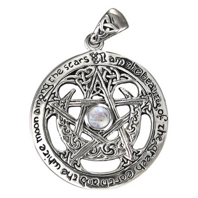 Sterling Silver Extra Large Cut Out Moon Pentacle Pendant with Rainbow Moonstone