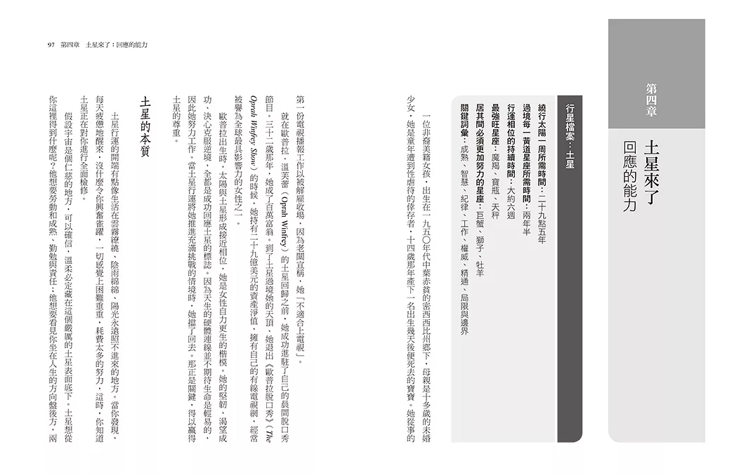 土星回歸,每二十九年才發生一次,這些週期,你會被逼著冷峻地審視過往的人生。二十九歲左右,第一次土星回歸,像是一記當頭棒喝,提醒你人生還來得及改弦易轍,或必須調整某些期待。第二次土星回歸,大約在五十八歲左右,是你後半輩子幸福的關鍵,在學習新知與分享所知之間取得平衡。