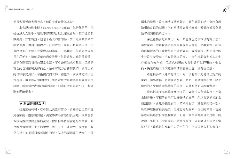 天空為限老師的解析,從基本的脈輪色彩學開始,結合占星專業說明元素、星座的對應關係,以及清楚敘述每張牌的道理與邏輯,在犀利的觀點中,帶著通透世事的暖意與智慧,提醒我們看似很好的牌可能隱藏著困境,不好的牌若換個角度也能有好的切入點,靈活解讀牌意,推導出合理又獨到的解釋。