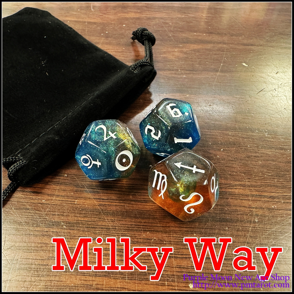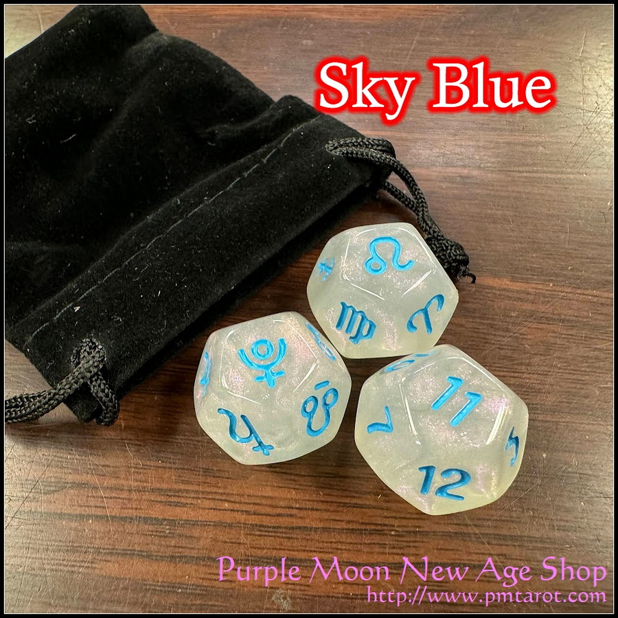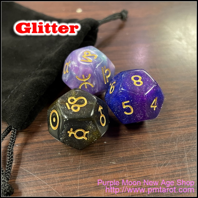Contains: 3x12 sided dice, 1 velveteen pouch, instruction included
