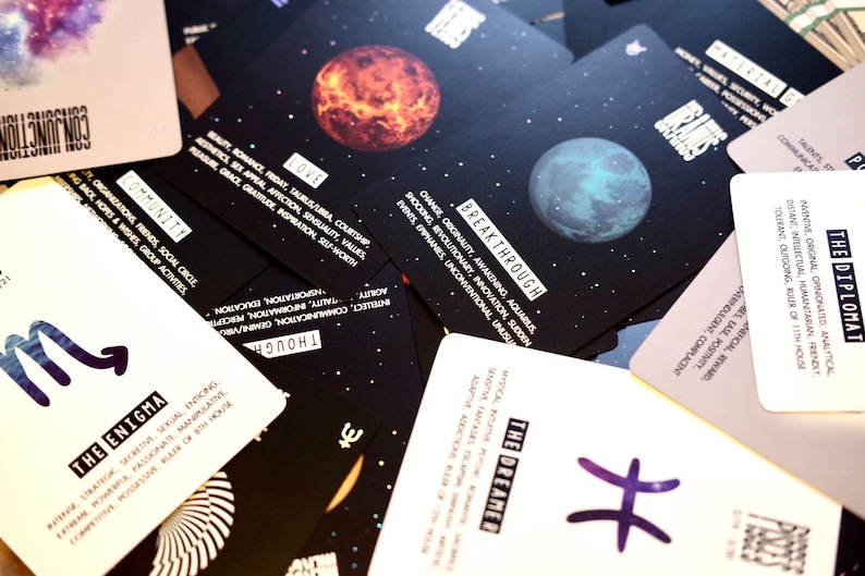 A unique and versatile 47-card astrology study guide/oracle deck that can be used in a multitude of ways. This deck is separated into four different categories: The Zodiac, Planets/Cosmos, Aspects and The Houses. It is a perfect way to learn more about yourself by using this with your natal chart. The themes on the card allow this to serve as an effective oracle deck to gain clarity on any aspect of your life. Additional ways this deck can be used are understanding current transits, using with tarot to better understand archetypes (ex: The Emperor - Aries as the associated zodiac sign, as a study guide to learn about astrology in general, and more.