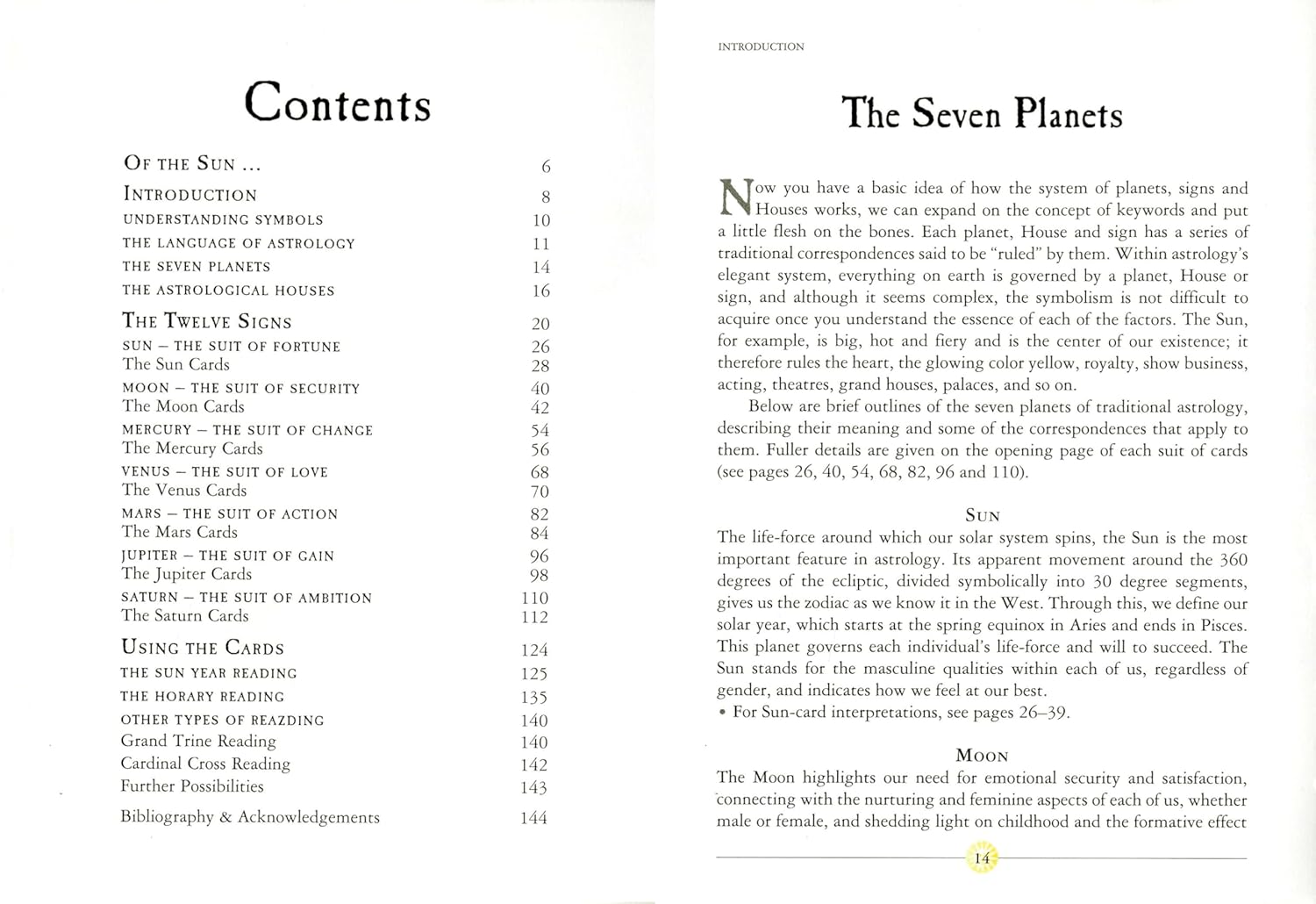 The powerful orb of the life-giving Sun has been worshiped from time immemorial. Its regular passage across the sky was used by the ancients to predict events, and this became the astrology we know today. Now, with 84 beautifully illustrated symbolic cards and comprehensive guidebook, you too can follow the Sun's path across the heavens and use its light to help guide your life. This oracle has seven suits, with each representing a significant planet as it moves through the astrological zodiac. Discover the meanings of the planets in the twelve astrological houses and zodiac signs, apply quick-and-easy reading methods for a range of consultation levels, and even receive a year-long astrological forecast. By shuffling the deck and selecting cards, you will find guidance on any question! This fun-to-use system will shed light on all your life issues in an accurate and perceptive way.