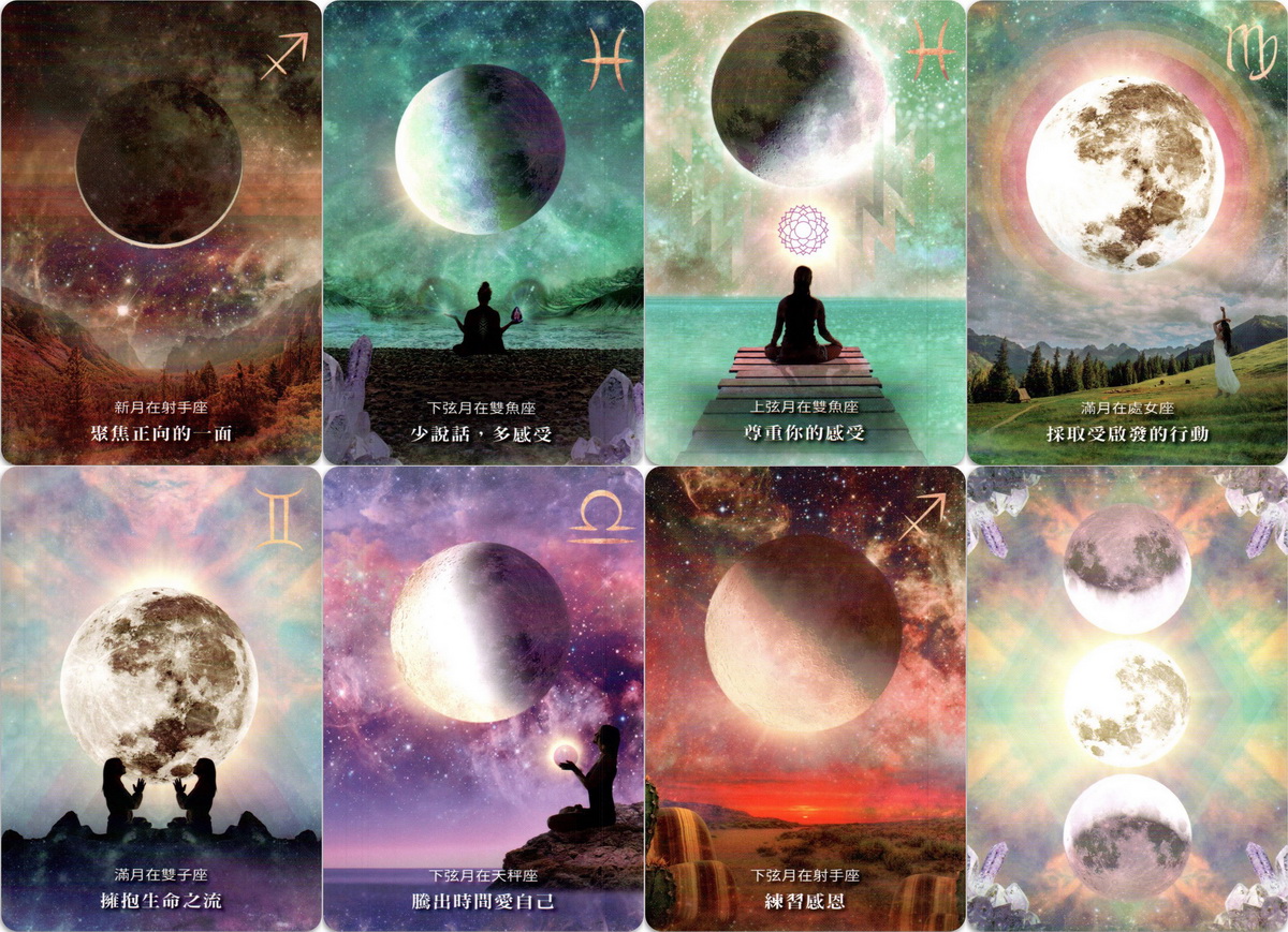 48張牌卡結合月亮週期的四個主要月相──新月、上弦月、滿月、下弦月,以及黃道十二宮星座的魔法能量。每一張牌都擁有自己獨特的訊息、頻率和力量,將揭露你當前正在顯化的內容,以及這些能量如何影響你日常生活中的情緒和體驗。