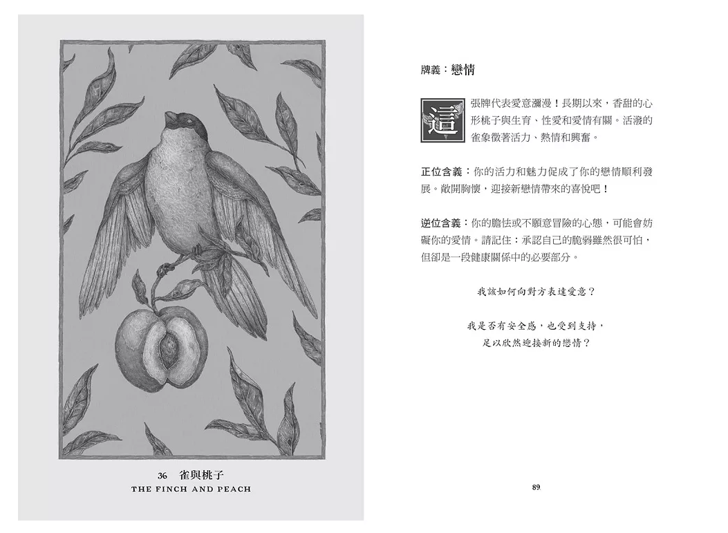 3. 128頁中文說明書(12.8*18.8cm),包含牌陣、正/逆位牌義、反思的問題、每張牌的由來等。