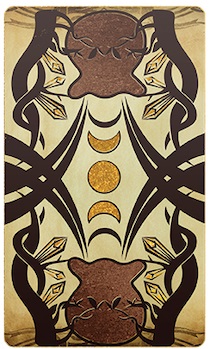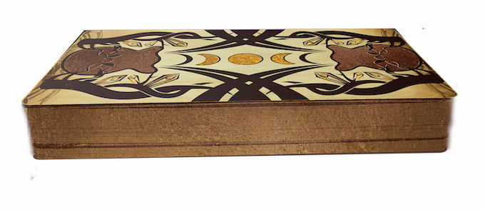 We have gilded the Tarot deck with bronze and our card backs will have two different foils - bronze and gold. The decks are coated with a protective UV spray matte finish that makes the cards easy to shuffle but not have a glare when light hits it, which can be very distracting during a reading. This also prevents the problem of the gilding and foil chipping which can be common in decks not coated with UV spray.