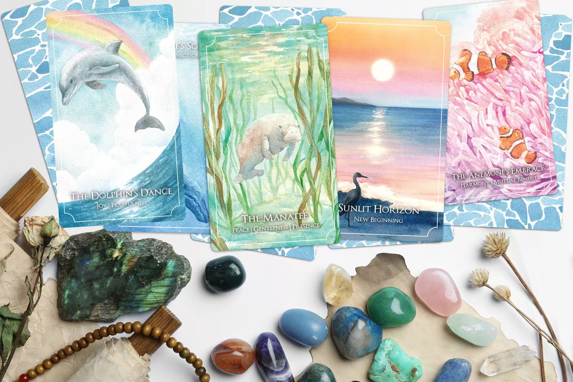 This deck invites you to explore its dreamy watercolor art and uncover messages of hope, strength, and joy. Feathers remind us of grace and freedom, while ocean waves reflect the ever-changing flow of life. Together, they weave a story of clarity and transformation, offering insights to help you navigate your path.