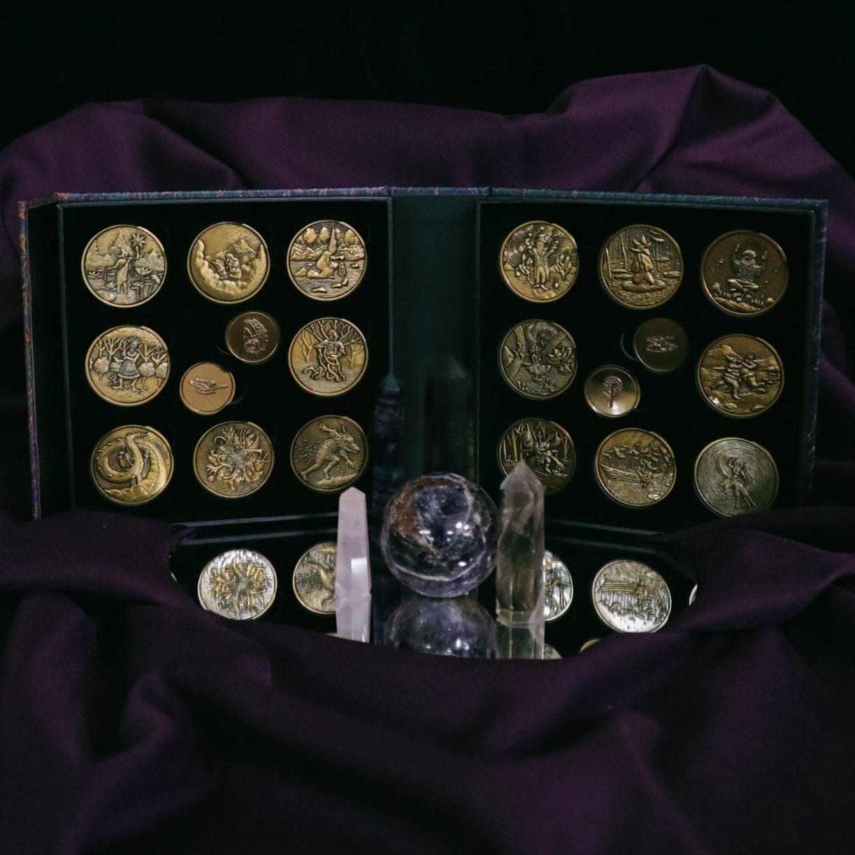 - 16 double-sided 1.5" coins. Each of these coins has the geomantic figure on one side and a 3D image of the corresponding being on the other side, inspired by the Suit of Beings from the Cosma Visions Oracle