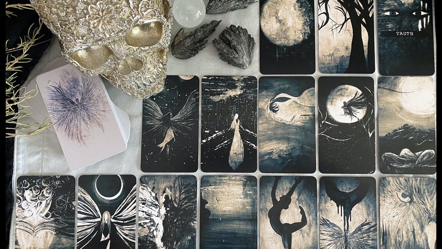This deck is 63 cards, featuring a darker aesthetic that features blues and sepia to white tones for the highlights. It's how I see the World when the moon is full and everything else is quiet. It reminds me of what it feels like to be completely separate from everyone and everything around me, but feel so completely connected and seen by The Goddess.