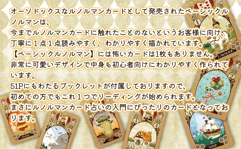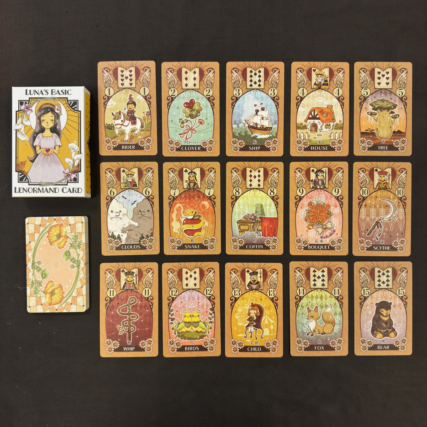 ・Designed as a classic and orthodox Lenormand, the Basic Lenormand was created with newcomers in mind. Each card is carefully illustrated to be easy to read and straightforward to understand. There are no “scary” cards—only adorable, friendly designs that make the cards approachable and welcoming, especially for beginners.