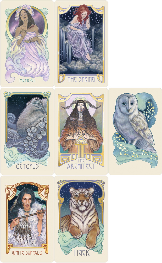Dreamscape Oracle presents 32 guides, some animal messengers, some mythological archetypes, to help us explore the liminal spaces in our lives. Together this oracle deck and 80-page guidebook allow us to interpret the messages we receive from our higher selves. This deluxe deck has gold foil stamping on the cards and box. The Dreamscape Oracle can be used as a stand-alone divination deck, or as a companion to the Ethereal Visions Tarot.
