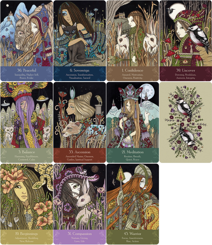 Universal Folk Oracle introduces 44 wise young women, attired in rich colors and patterns to reflect the complexity of our inner selves and the various stages of our growth. The artist has created this culturally nonspecific “universal folk” style to help us bond together as a unified world community. For each card, a healing crystal is also identified to help with your intuitive inquiries and self-care practices. Universal Folk Oracle guides us to discover and master our own universe.