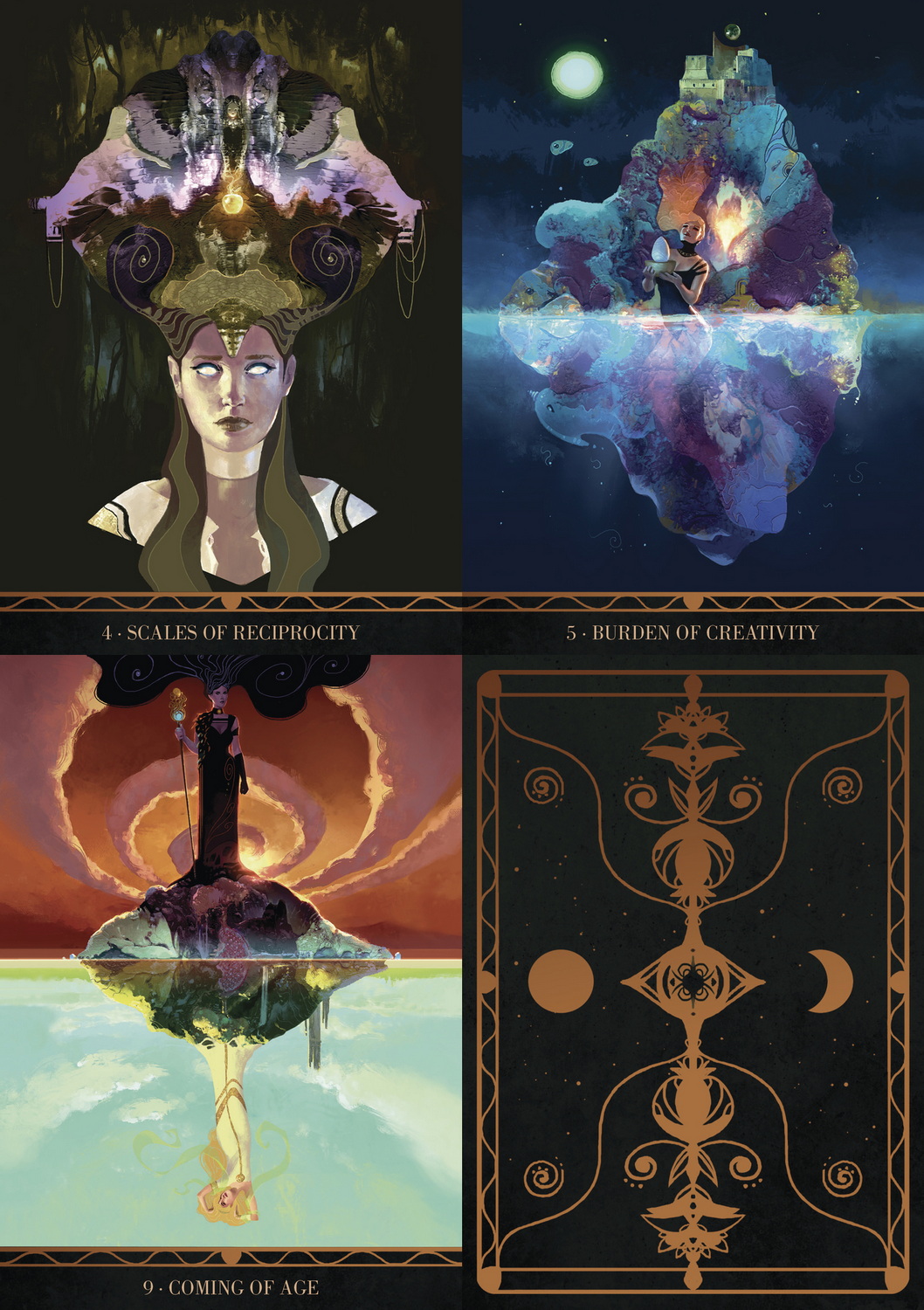 This 36-card Oracle deck, written by Riccardo Minetti and illustrated beautifully by Barbara Ciardo, gives birth to a realm where light and dark come together and mirror each other, creating perfect symmetries and fascinating perspectives on the subconscious and its unrequited mysteries.