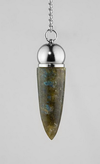 This labradorite pendulum shines with reflected light. It has a 5-inch curb chain with a clear quartz bead at the end.