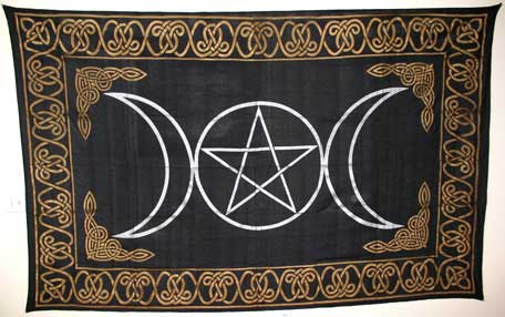 Marvelously woven of heavy, 100% cotton, this tapestry presents the central design of the silver pentacle symbol of the Triple Goddess. With a fringe around its borders, this symbol is set upon a black background and surrounded with an intricate pattern of Golden Celtic Knotwork at its borders. Hanging 72" by 90" it makes for a fantastic bed spread or decorative addition to your wall or ceiling.
