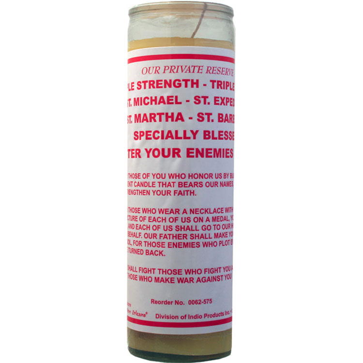Candle is dressed with glitter and oils. Our Private Reserve Triple Strength, Triple Action, St. Michael, St. Expeditus, St. Martha, St. Barbara Specially Blessed Master Your Enemies Candle
