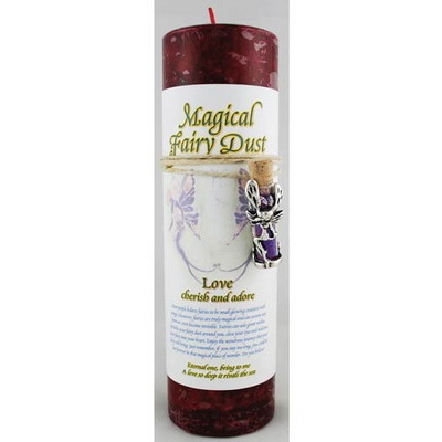 Find a love you can cherish or strengthen the adoration and connection you feel with the world around you with a little bit of fairy magic and this enchanting scented pillar candle. Standing 6 1/2" tall and measuring 2" in diameter, this wine red candle is sent along with a small vial of fairy dust tightly sealed in an pewter and glass enclosure with a fairy design. Set on a natural white cord, you can carry this 1 5/8" vial of fairy magic with you as you go about your day.
