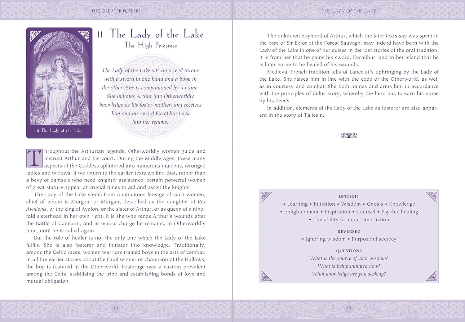 Journey into Arthur's kingdom through the 22 Greater Powers of the Arthurian realm, together with the 56 Lesser Powers depicting the landscapes of Logres, the ancient Arthurian kingdom that lies outside of time. The book includes a complete meditation course leading you around the year, with the characters of the Arthurian world as your guides and teachers, along with detailed card meanings, divination methods and a wide selection of consultation spreads.