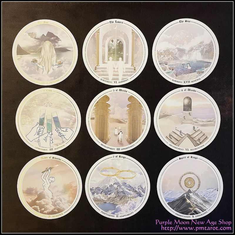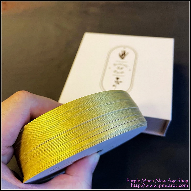 Circular shaped cards adorned with gold foil highlights, gold gilt edges & a soft velvet laminate finish brings a new level of luxury and depth to your tarot reading experience.