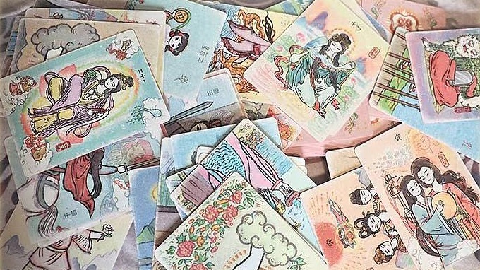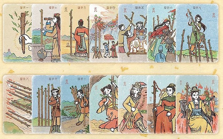 The artwork draws inspiration from "lianhuanhua" (连环画; a type of palm-size picture books popular in 20th-century China). Expect brushy lines, grainy colors, and lovingly hand-drawn clay dolls in vintage robes. Chinese folkloric motifs run throughout: lotus ponds, tiled rooftops, drifting mountain clouds... giving the deck a unique cultural warmth.