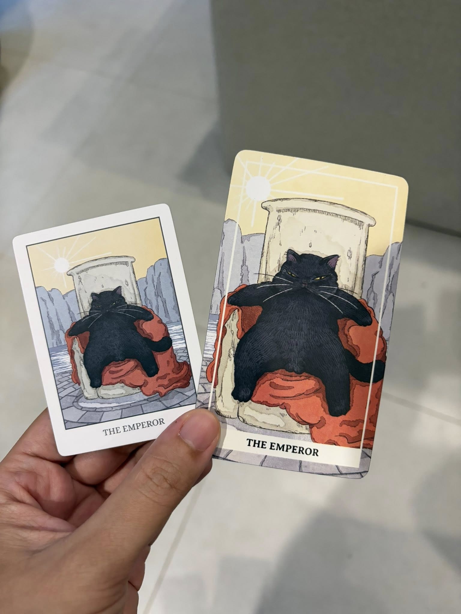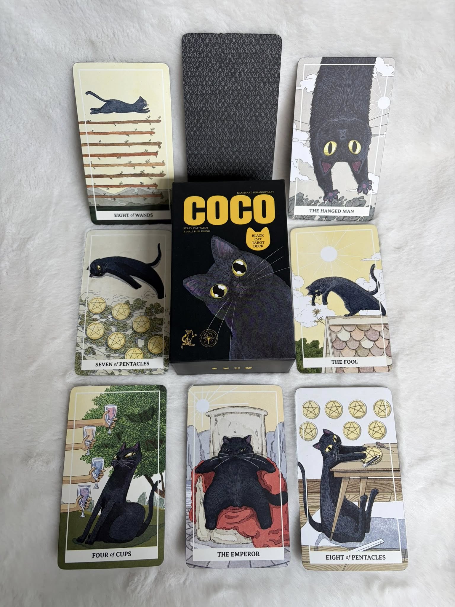 Forget the stiff or intimidating imagery of ancient decks; here, the spiritual journey is guided by Coco, a wide-eyed, expressive black kitty. You will see him playfully hanging upside down as The Hanged Man, napping on the Emperor’s throne, or curiously pawing at the Pentacles. The artwork radiates a cozy, playful energy, staying true to the traditional Rider-Waite-Smith system while stripping away the fear, making the messages accessible and heartwarming.