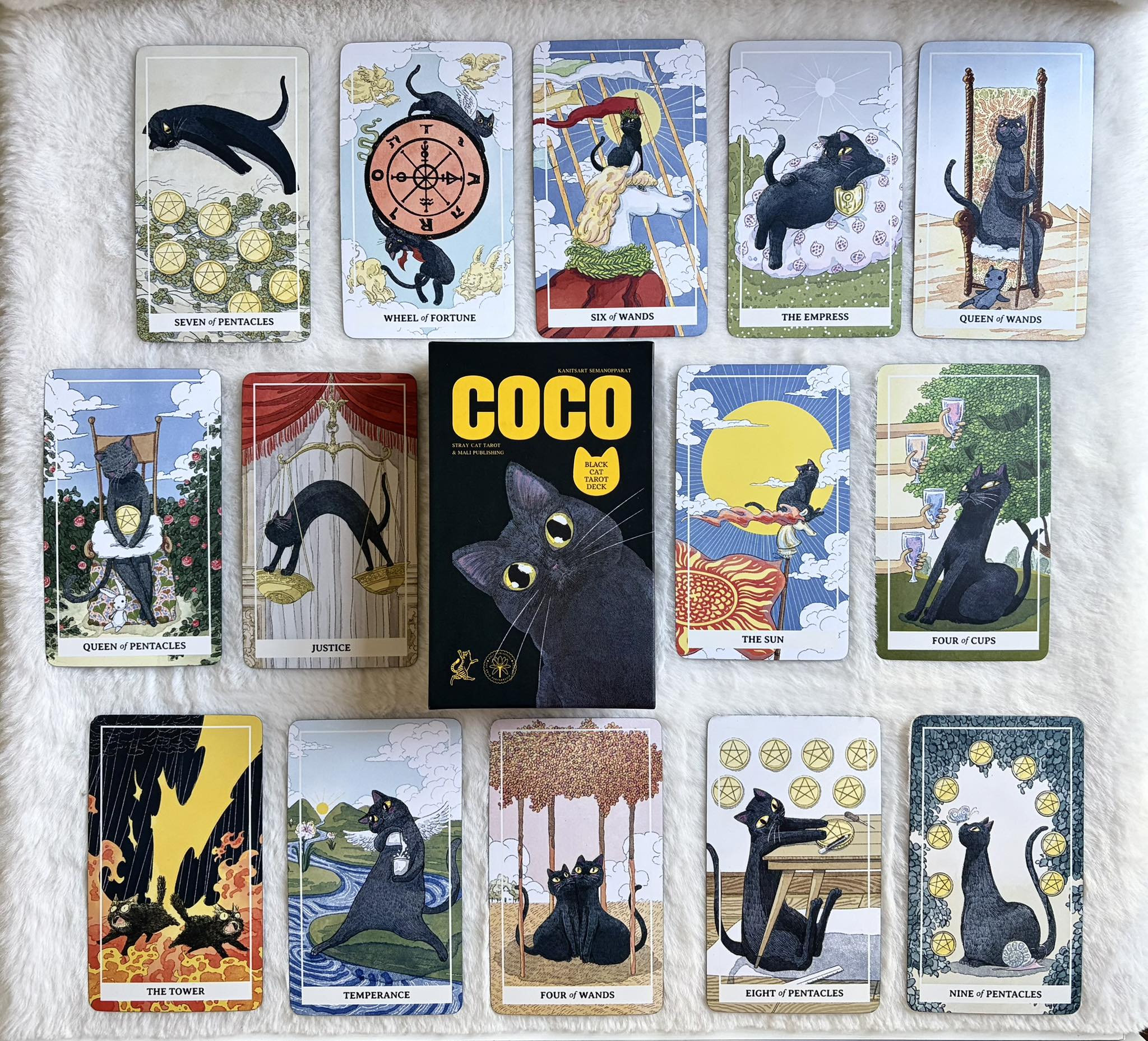 This item is required advance payment to order and estimate arrived in 1-3 weeks.Have you ever looked into a cat's eyes and felt they understood more than they let on? Invite that intuitive connection into your sacred space with a truly magical Tarot Deck that purrs with personality. From the gifted artist behind the best-selling Lunalapin Tarot, the Coco Black Cat Tarot is here to add a sprinkle of joy to your daily rituals.