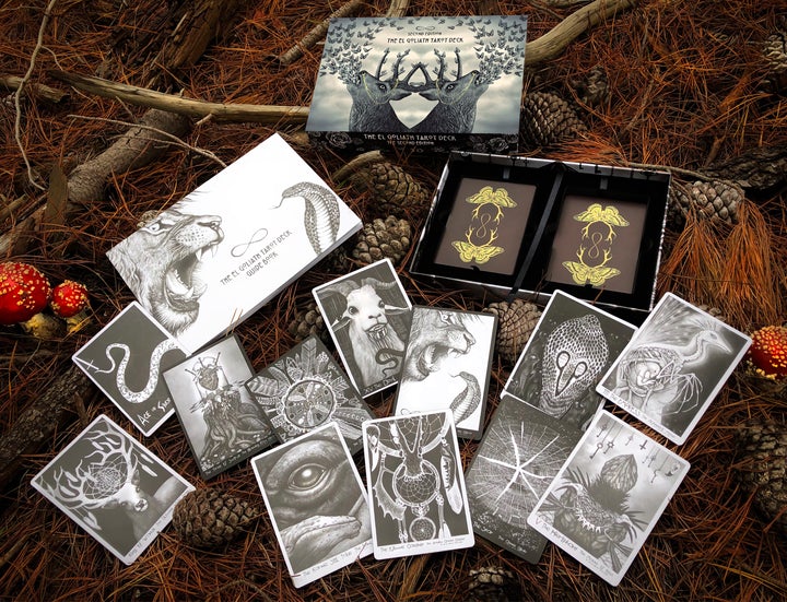 Alchemical, Shamanic, Shadow Tarot Manifesto suited for spiritual exploration, readings, and guidance! The El Goliath Tarot Deck is comprised of the traditional 78 card RWS Tarot system, and features an additional 17 bonus cards that are unique to the Tarot.