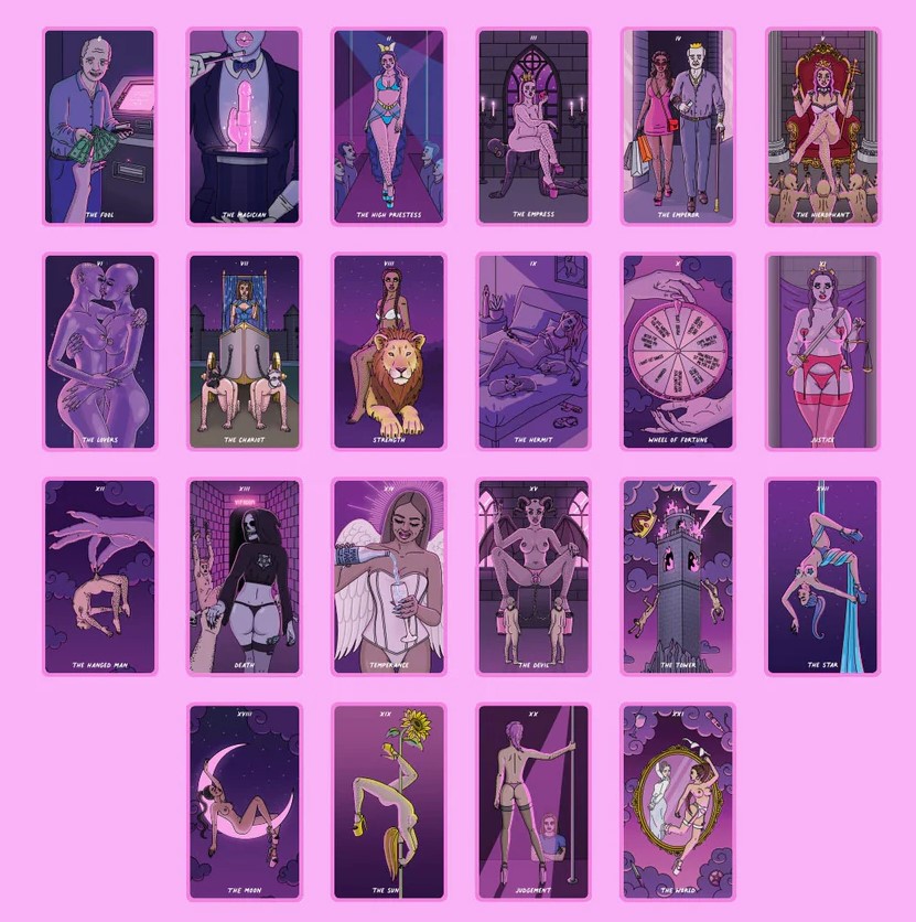 Artist Exotic Cancer's unique tarot deck is based on the classic Rider Waite deck but with a dark, sexy twist. The deck includes the full 78 cards, each with unique illustrations and pink backs with beautiful holographic edges. Includes a guidebook for beginners.