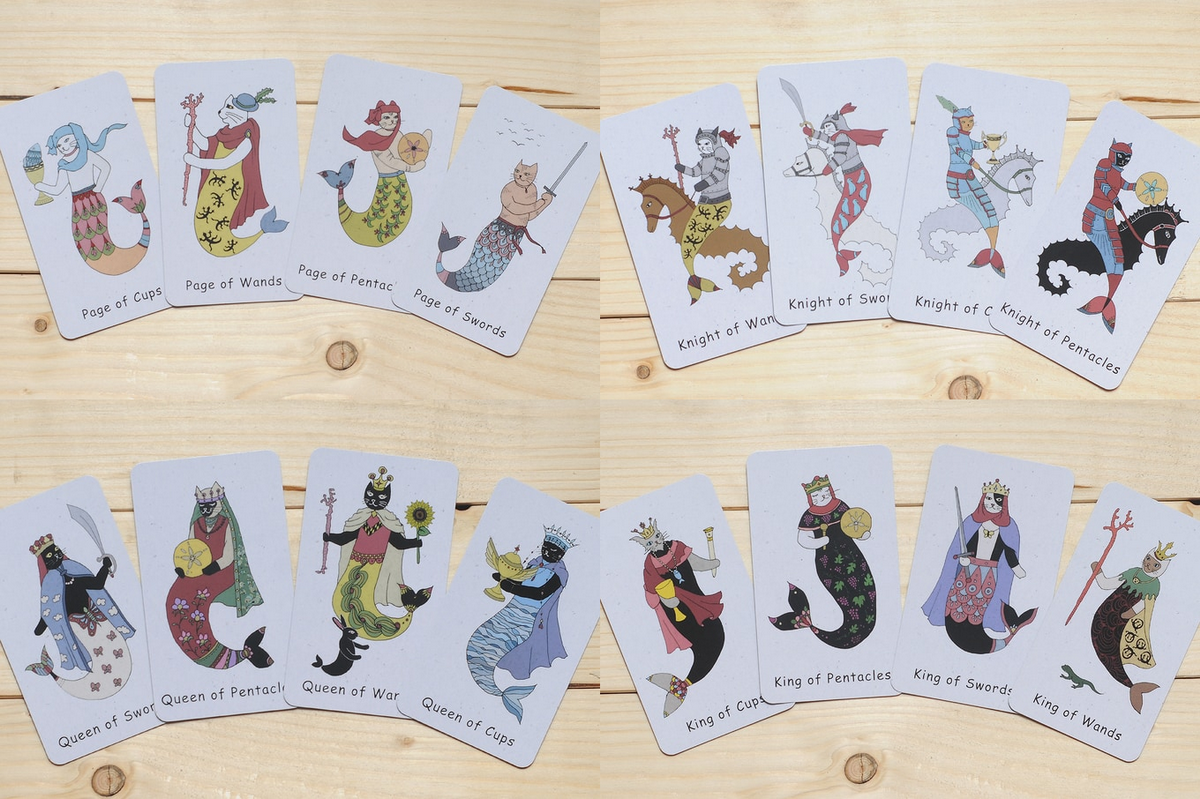 I initially created this deck for myself, because I couldn't find one that spoke to me. Since the right deck for me wasn’t on the market, I decided I’d have to create it for myself! Why mermaid cats? I've been doodling these imaginary creatures for a few years, because I love and live with cats and tropical fishes. I realized that I had been developing my own visual language for oracular interpretation.