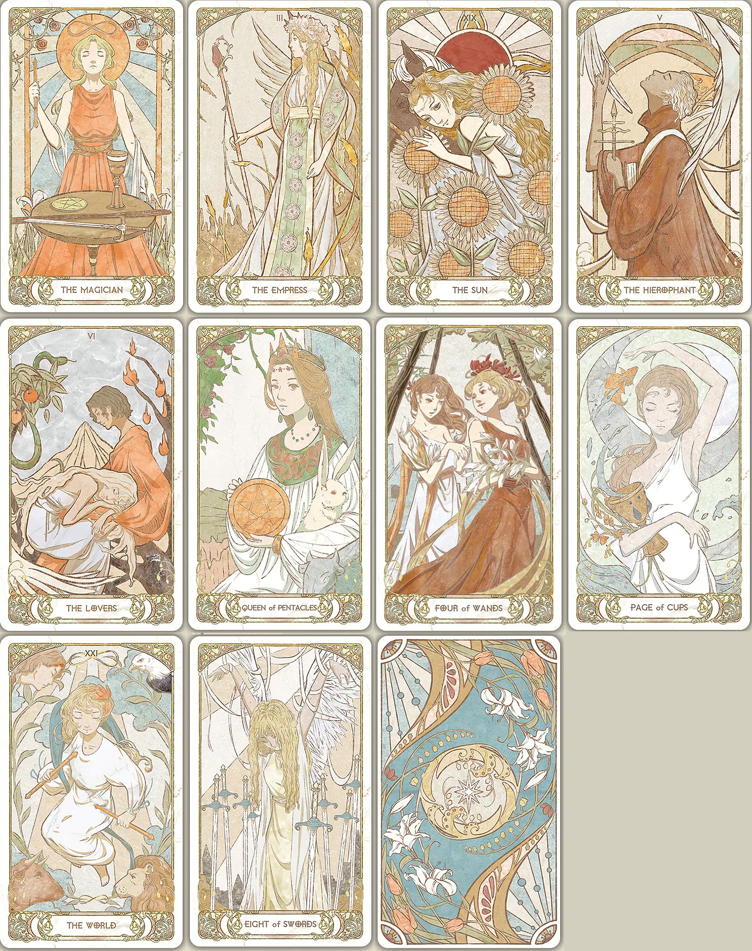 Czech artist Alphonse Mucha has become a timeless classic with his unique decorative art style. The Moravian Tarot uses graceful and smooth lines, elegant and fresh watercolors and gorgeous decorations to show the fresh, elegant and vibrant Art Nouveau style.