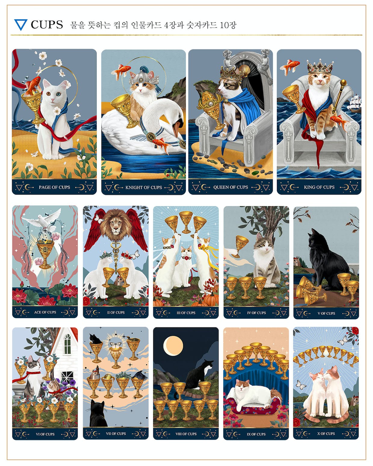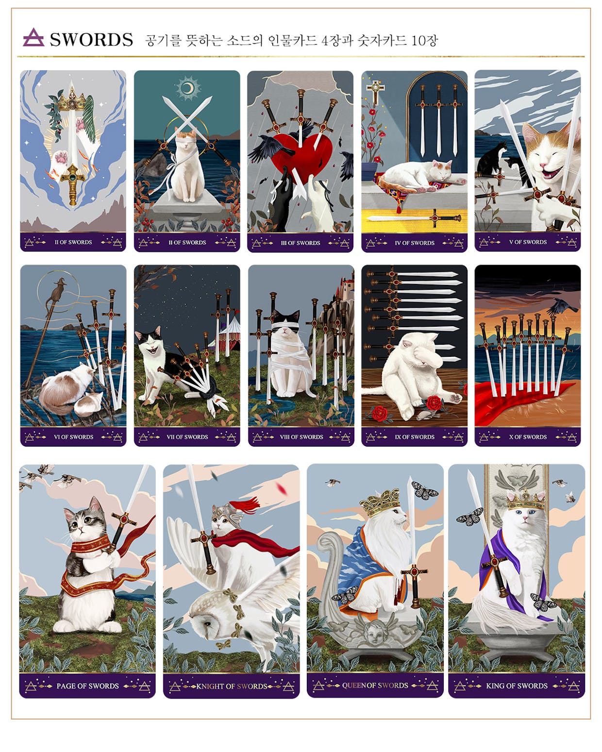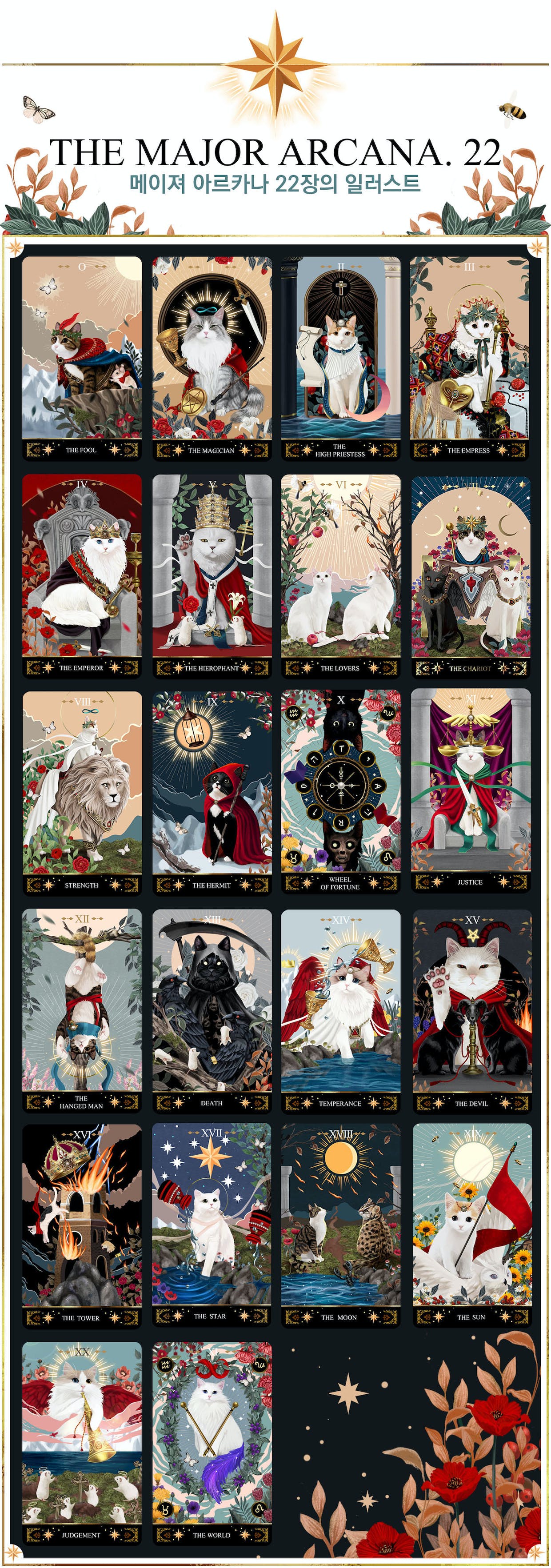 The illustrations of Musecat Tarot are cards made with the request and interest of many supporters, as well as my affection and passion. I worked with a classic color and style, and I worked with the details of the symbol as well as the expression of the cat to make it easy to read without departing too much from the existing universal waite.