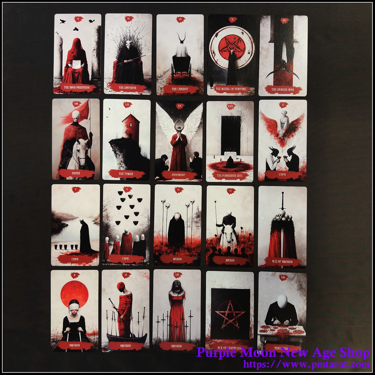 This deck has a striking gothic style, using deep symbolism, ritual imagery, and a bold red-and-white color scheme. Each card is carefully designed to feel powerful, mysterious, and immersive.