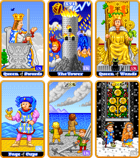 The Super 8-Bit Tarot is a standard 78-card tarot deck based on the classic designs of the Rider-Waite deck, but with a classic arcade pixel art treatment. Each card was designed by Indigo Kelleigh at the resolution of 88x152 pixels using only the colors in the default 8-bit Mac OS color palette.