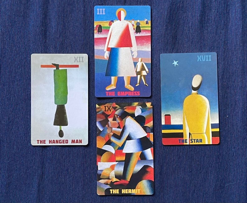 Thus, the Arcana of Carre Noir Tarot, rooted in suprematist and figurative compositions, depart in their iconography from traditional thingness. They allow to extract from each symbol and each image a pure emotion and vector that facilitates vivid and multifaceted Tarot readings.