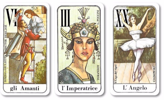 Theme: the world of music. This deck by Menegazzi, was done in consultation with Paola Maino and with the collaboration of Giovannino Scarsato. The fronts are glossy; the backs a solid color. Card titles are in Italian. Each of the characters or scenes in the Major Arcana are a depiction of an opera which illustrates the meaning of the corresponding card. Along the side of the image (written sideways), is the Italian name of famous opera compositions, and the composer; classics from Giuseppe Verdi to Chopin.