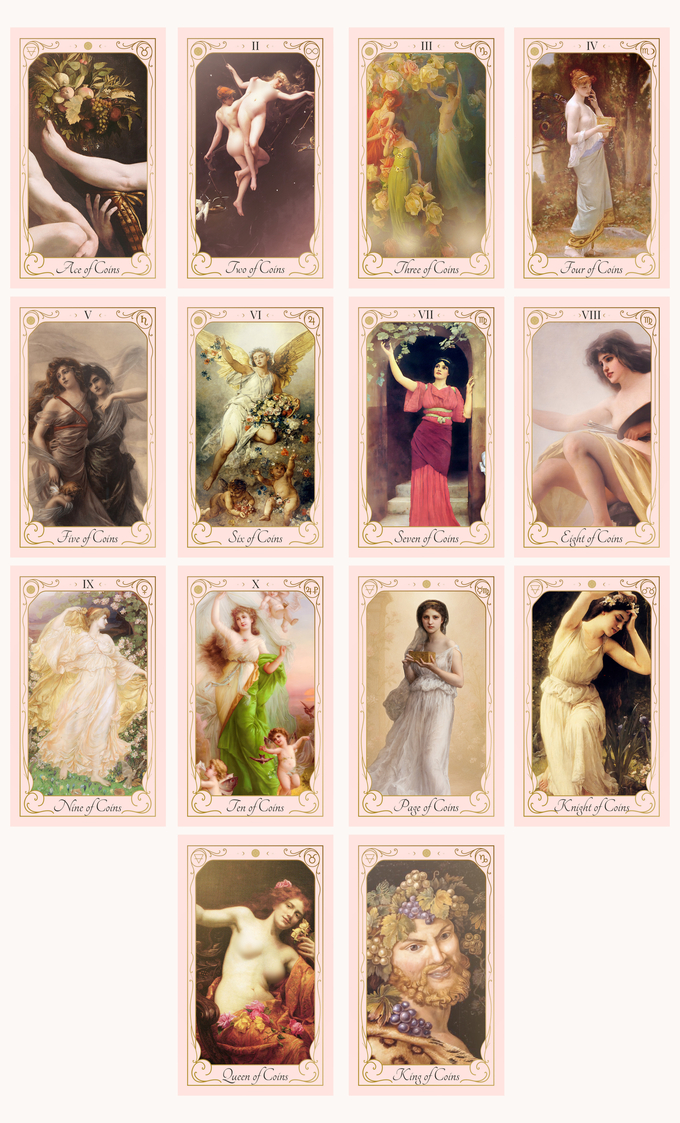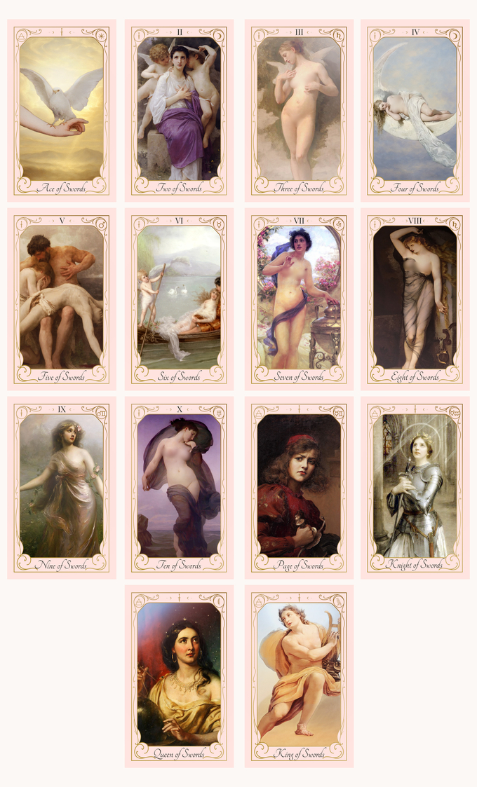 This 78-card tarot deck is infused with timeless romance and sacred sensuality. Each card features fine art I’ve either carefully restored or reimagined into a new context. Some have glowing new backgrounds, some are layered painterly collages, others are color-shifted masterpieces from the Belle Époque or Baroque era.