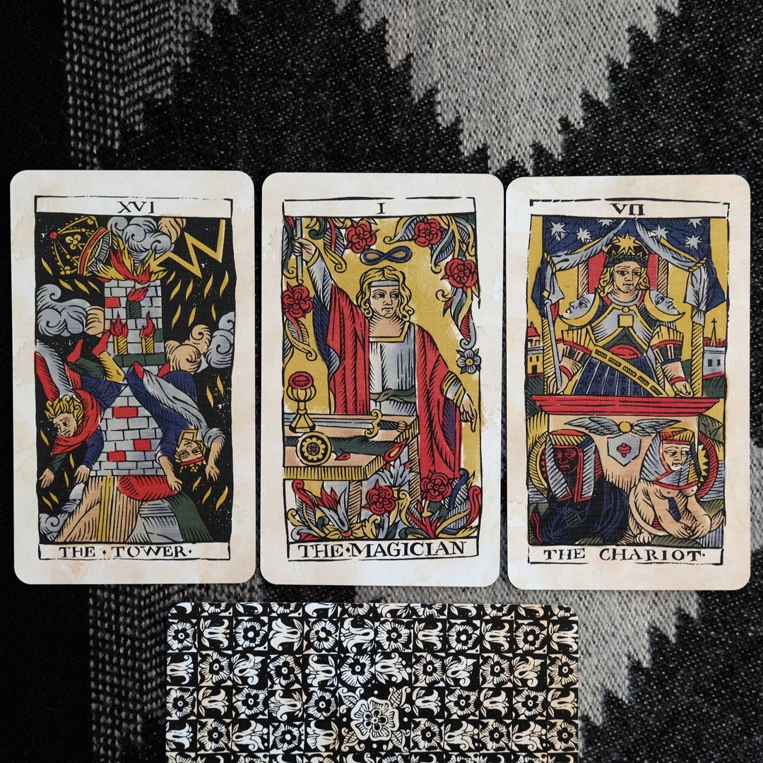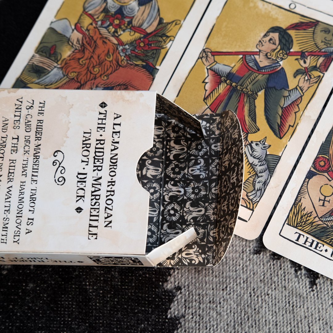 The Rider-Marseille Tarot Deck features imagery from the Rider-Waite-Smith Tarot, designed by Pamela Colman Smith and Arthur Edward Waite, combined with the historical influences from the 17th century Tarot de Marseille. To create the images, Alejandro hand-drew and digitally colored each card to emulate woodblock printing and stencil coloring techniques.