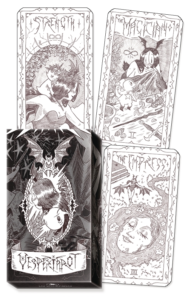 This Tarot tells the story of Vespertiliu, the half-human-half-bat protagonist who sets off for an amazing adventure with Macigian, a little sorceress who will guide her along the magical journey through the Arcana. This exclusive narrative deck is the latest addition to the Horizons line of Lo Scarabeo, offering new, stunning black-and-white art with an original pencil-style linework, and a reading experience in every sense of the term.