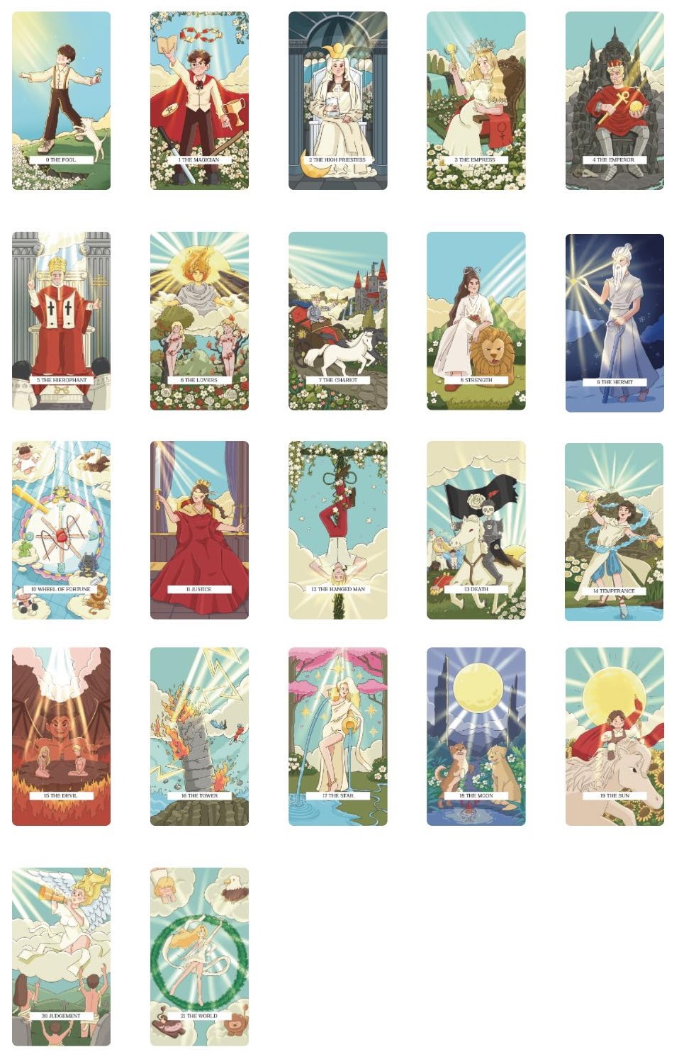 Ever peek outside and wonder what kind of day the clouds are having? Forget weather reports, the White Clouds Tarot is your sky whispering secrets in your ear! This 78-card deck is a whimsical adventure where sunshine-bright cartoons frolic on fluffy white clouds, each one a tiny weather guide for your own inner world.