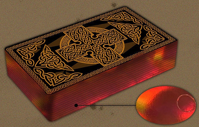 - 330 gsm German three-layer black core paper, air layer embossed (front & back), smooth pressuring (edge), metallic ink (front, back & packaging) & UV printing (packaging)