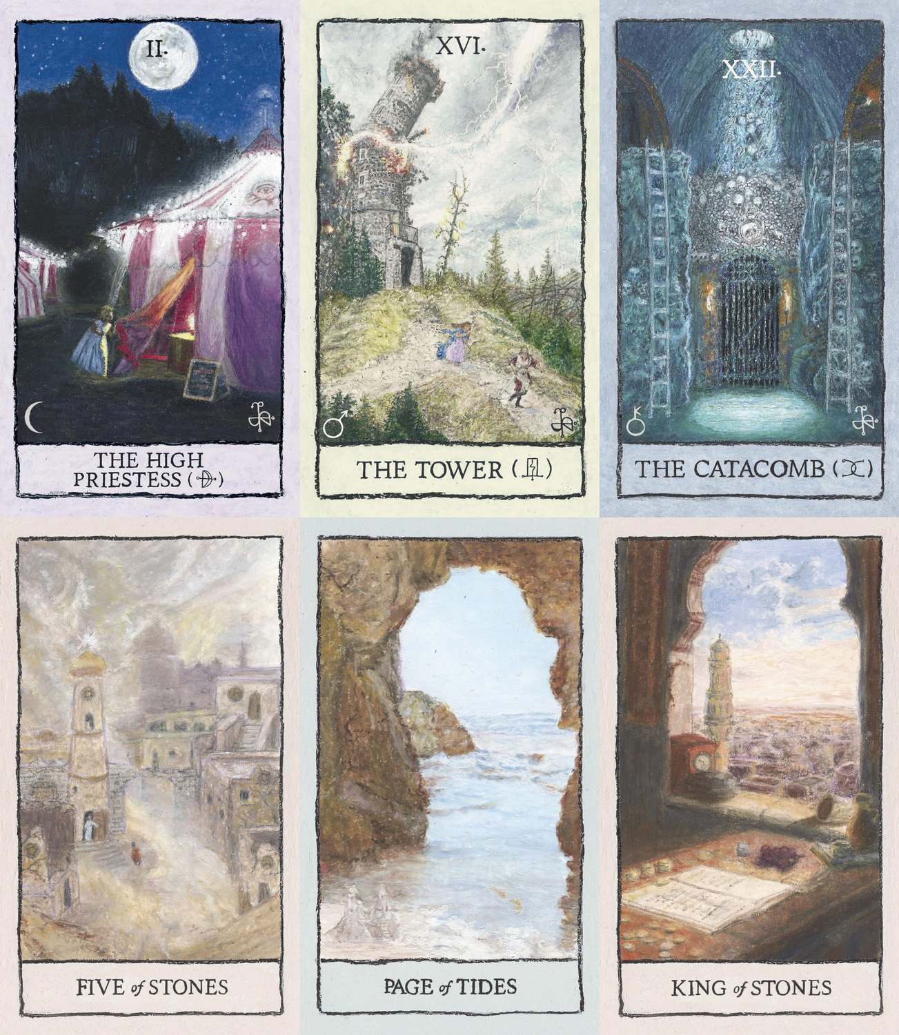 Mindscapes Tarot is a vivid reimagining of the tarot, hand-drawn in oil pastel in the style of classical landscape painting—each card a window to magical worlds of forests, seas, mountains, and cities and a window to our innermost selves.