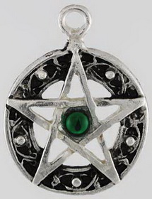 This lead-free pewter pentacle is a wonderful tool for growth, prosperity and fertility. Bordered in Celtic knotwork to aid in the integration of the five pentacle points; the piece is set with a green Swarovski crystal. This pentacle measures 1 1/8" in diameter