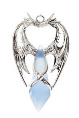 Two dragons are embracing one another and a milky quartz faceted crystal and can be worn "for second sight and psychic protection".