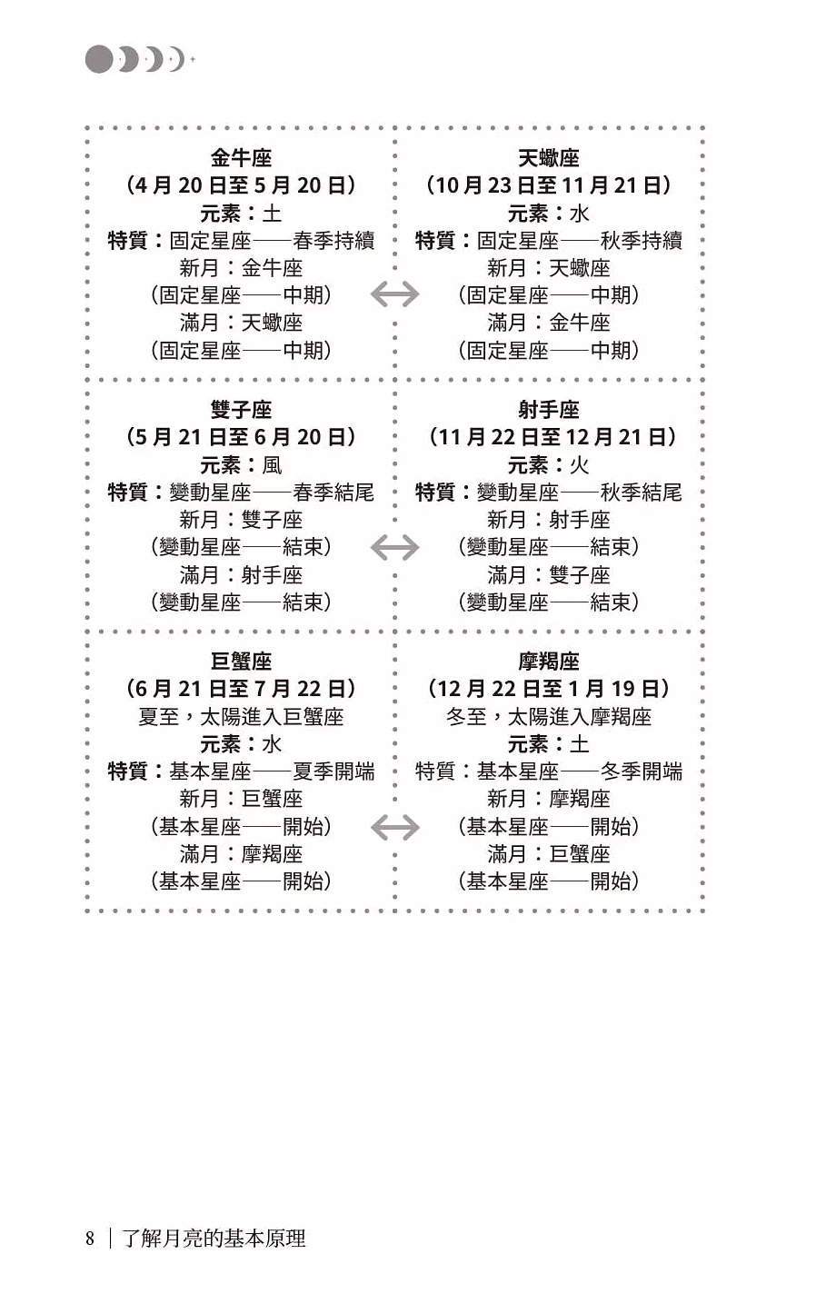 本書提供多種實用工具——從心願練習、肯定句與感恩日記,幫助你釐清方向、培養自愛與正向能量;並透過陰影書寫與鏡子練習,溫柔地面對情緒,整合自我。同時解析月亮落在十二星座蘊含的能量與課題,揭示新月願景與滿月釋放的最佳時機。