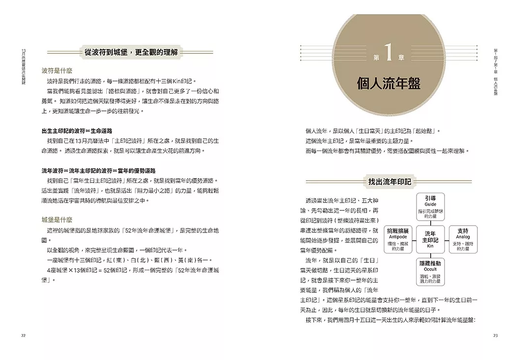 深耕身心靈領域十多年的盈君老師,以13月亮曆法為基礎,結合心理諮商與靈性成長的經驗,引導讀者深入了解每年的能量主題和挑戰,並在生活中實踐這些洞見。學習曆法,並非要將人限制在另一個框架或標籤中,而是希望透過認識自己的真實本質和限制,找到跳脫框架、讓生命自由寬廣的道路。在這本書中,能學到個人流年盤的運作方式,解讀流年印記、波符和城堡的意義,以及如何將這些資訊應用在生活中。