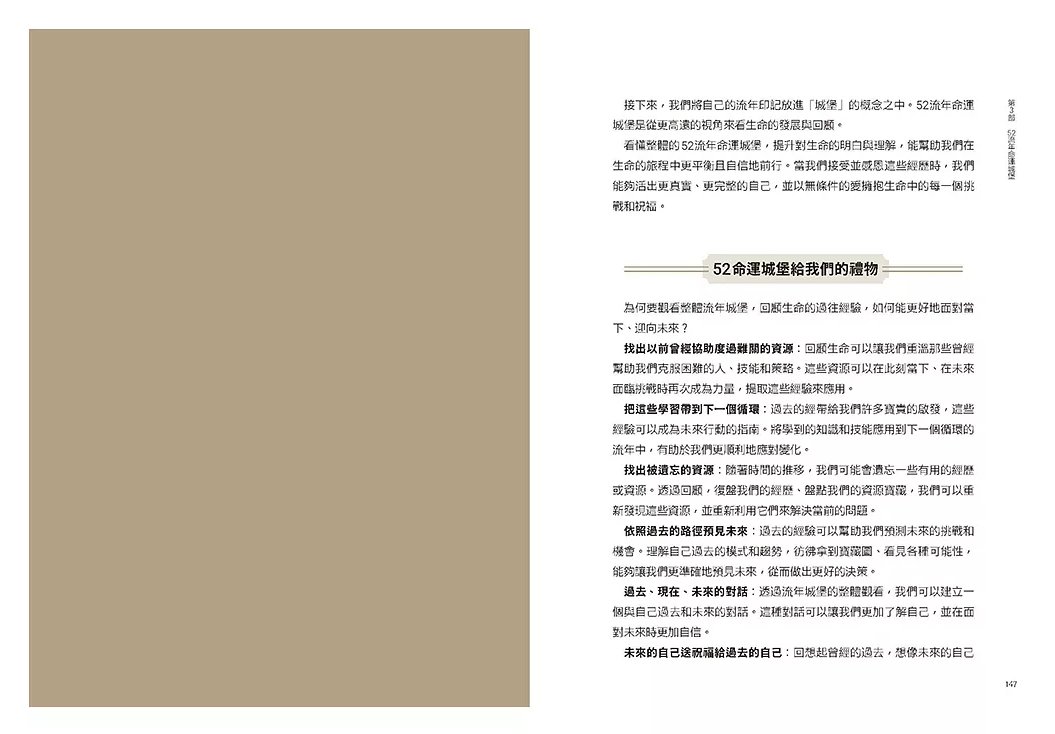 而52生命城堡就像一張個人專屬的人生地圖,展示了我們從出生到現在,以及未來可能經歷的能量主題和挑戰。透過回顧自己在每個城堡和流年中經歷的重要事件,可以發現過去是如何克服困難、找到資源和力量的,這些經驗就是我們未來面對挑戰時的寶貴資產。52生命城堡以循環的方式呈現,讓我們更容易看到生命中重複出現的課題和模式,通過覺察這些模式,可以更有意識地做出選擇,並找到阻力最小的道路。52生命城堡將生命劃分為不同的階段,每個階段都有特定的能量主題和挑戰。了解這些階段的課題,能夠讓我們更有準備地面對生命的變化。透過52生命城堡,我們可以更清晰地看到自己的生命藍圖,以及靈魂在這一世想要學習和體驗的主題。這樣的洞見可以幫助我們活出更真實、更符合靈魂使命的人生。