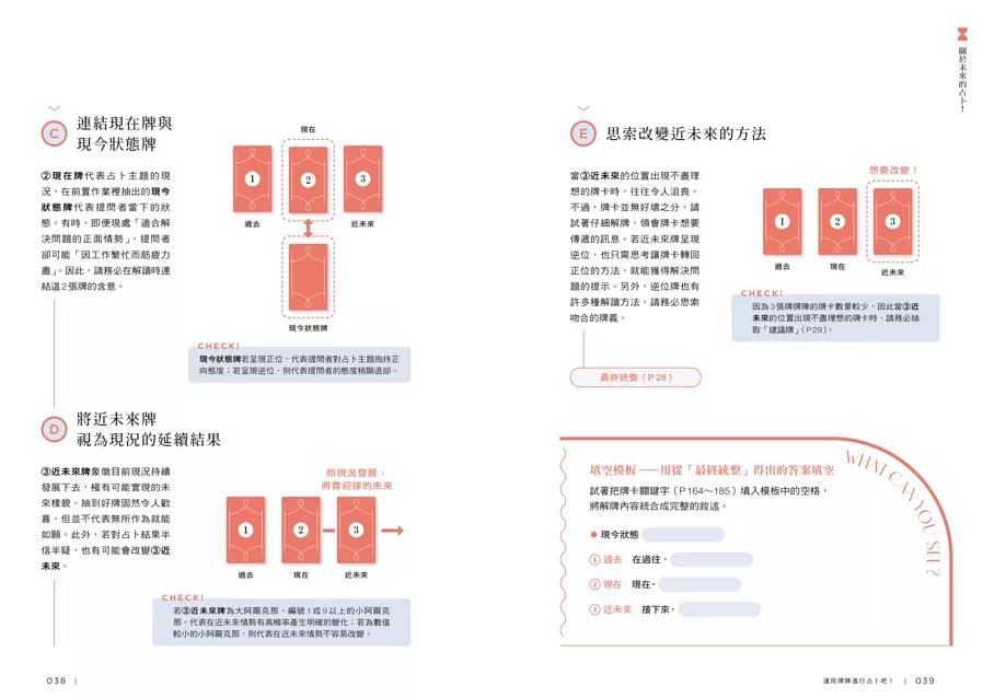 依照問題選擇適合的牌陣,並搭配重點提示與實戰案例,掌握多張牌的連結與關係。