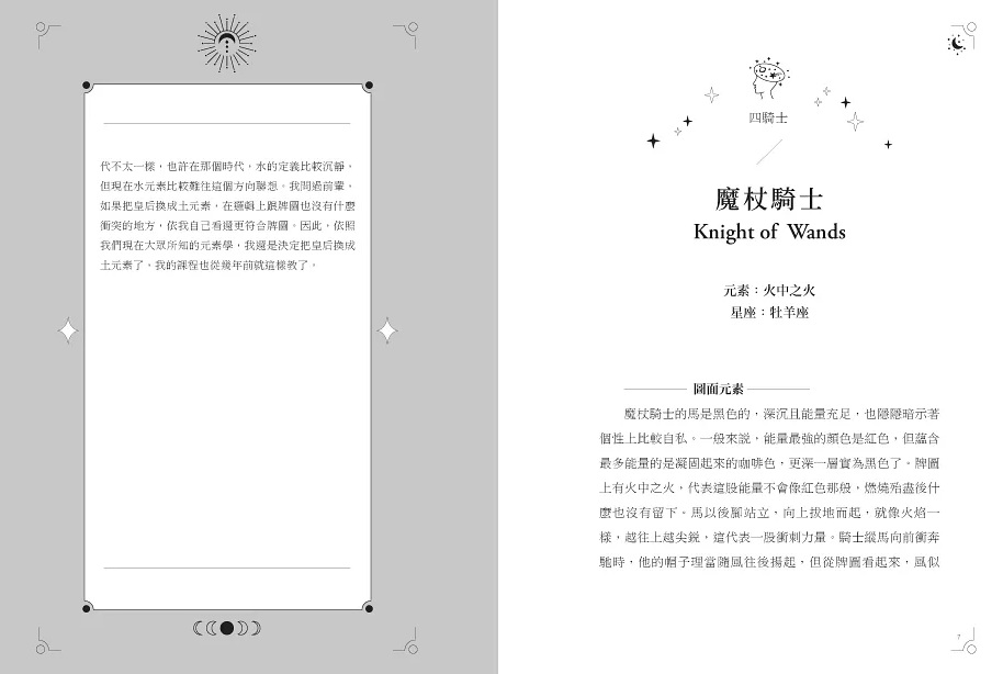 天空為限老師的解析,從基本的脈輪色彩學開始,結合占星專業說明元素、星座的對應關係,以及清楚敘述每張牌的道理與邏輯,在犀利的觀點中,帶著通透世事的暖意與智慧,提醒我們看似很好的牌可能隱藏著困境,不好的牌若換個角度也能有好的切入點,靈活解讀牌意,推導出合理又獨到的解釋。