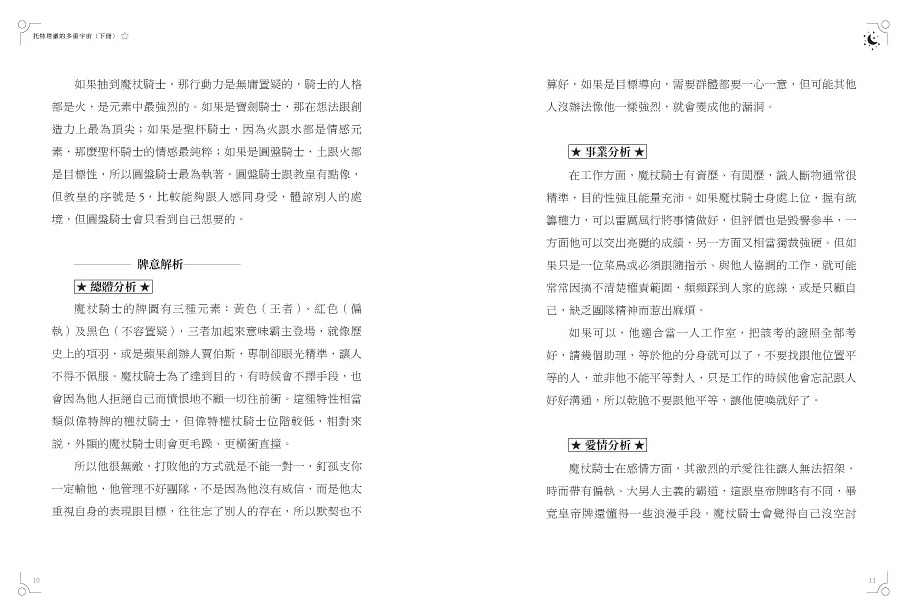 對於占卜工作者或新手小白,這本書將托特塔羅牌看似神秘、複雜、難學的節點,一一梳理開來了,只要了解基本邏輯,就能提升準確度,穩定每次解牌的品質,不再單純依靠直覺解釋牌意。同時更快地藉由牌卡的層層涵義,觸摸到案主和自己的內心,提供直指核心的解答,找到更多理解、解決問題的角度。