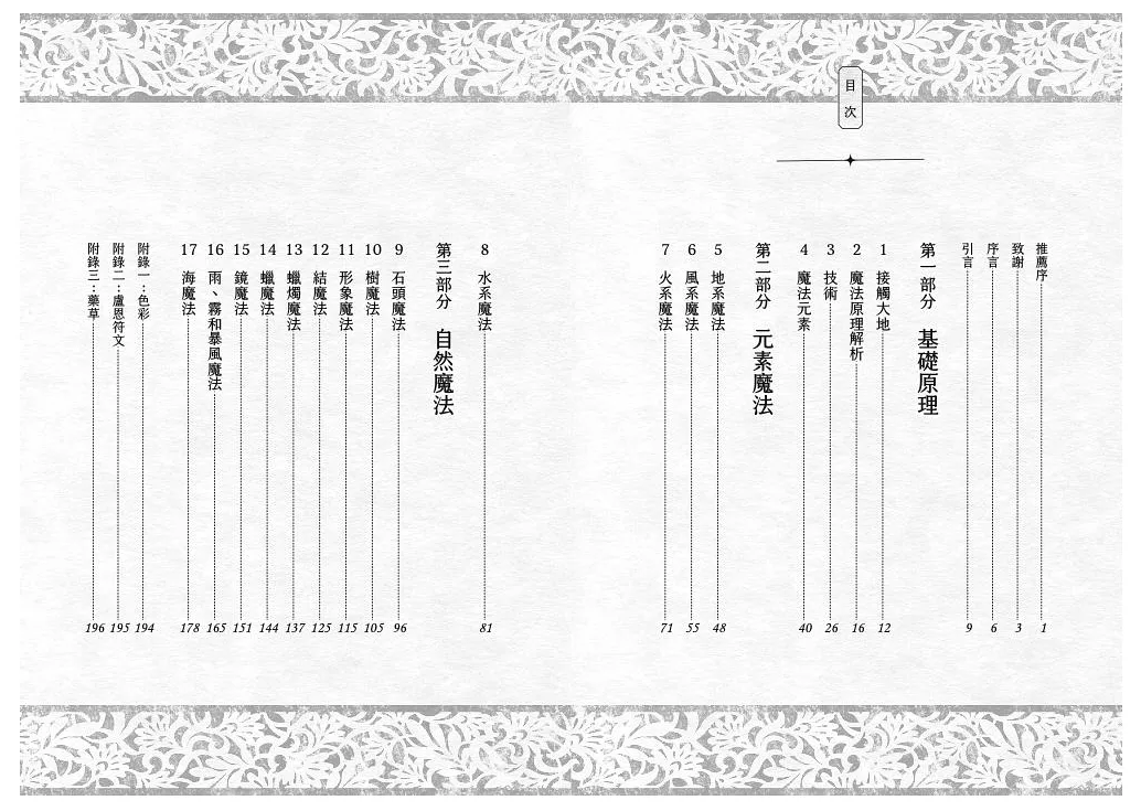 - 四大元素X「石頭、樹、雨與霧」等9種自然魔法,提供超過100種與自然相關,實證有效的咒術、儀式。